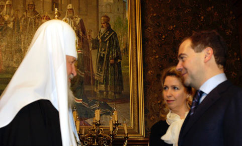 Президент подарил Патриарху картину, на которой был изображен Ново-Иерусалимский монастырь.